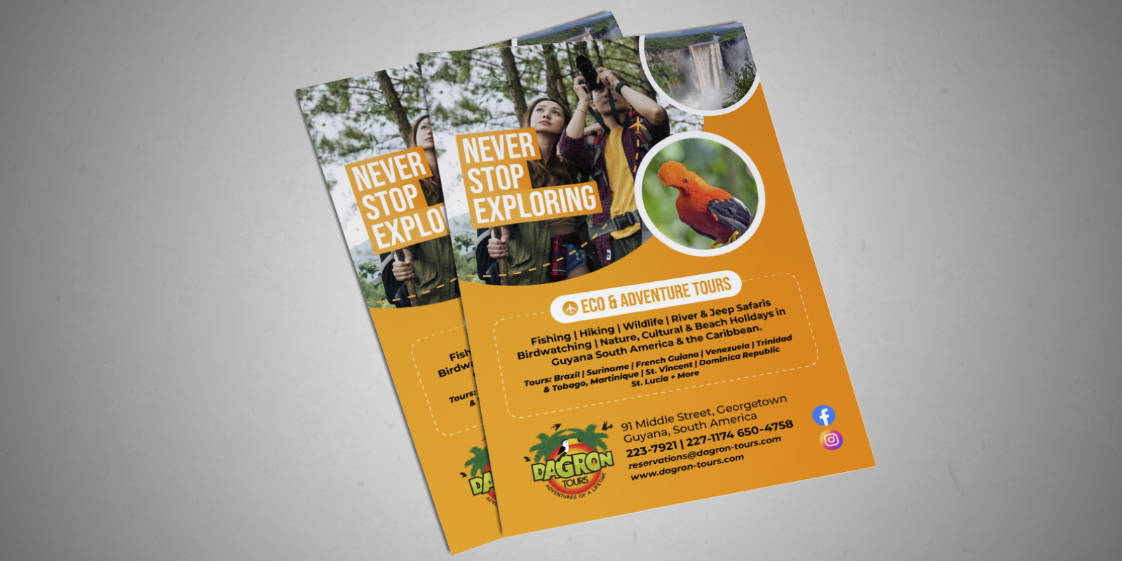 Dagron Tours needed a vibrant, easy-to-read outdoor-ready layout that could quickly communicate their most popular tour categories and destinations. We designed a high-impact promotional visual with clear hierarchy, strong imagery, and booking-forward contact placement—perfect for print and digital placements.
